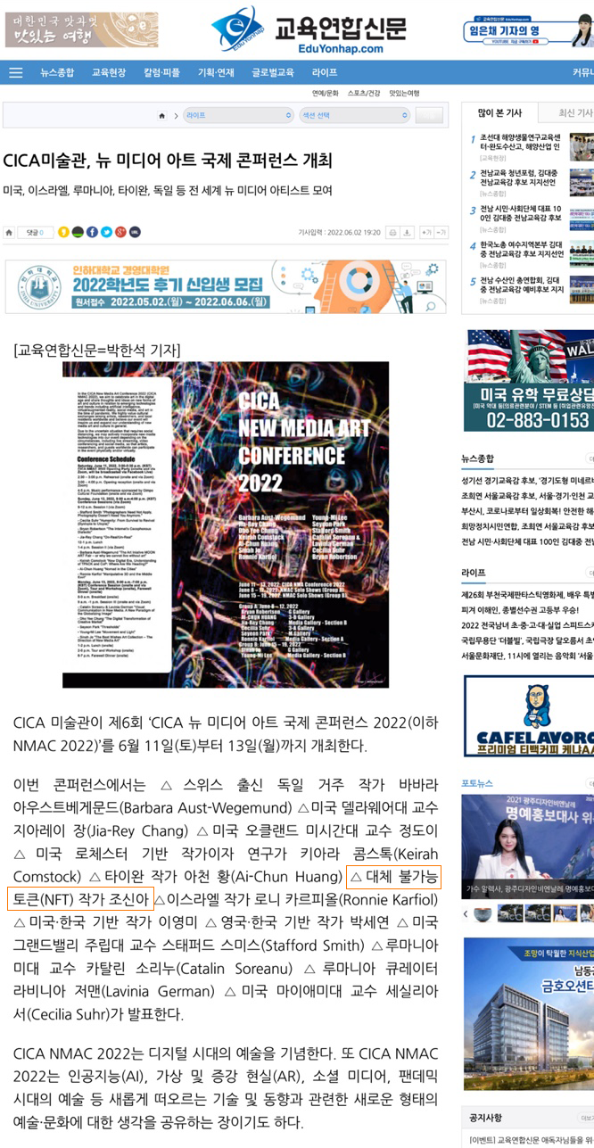 - 2022 CICA NMAC 뉴미디어 아트 국제 컨퍼런스 & 개인전 - CICA 미술관 (Jun. 15 ~ Jun. 19, 2022) CICA NMAC 2022 | CICA New Media Art International Conference and a solo exhibition